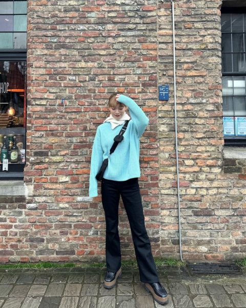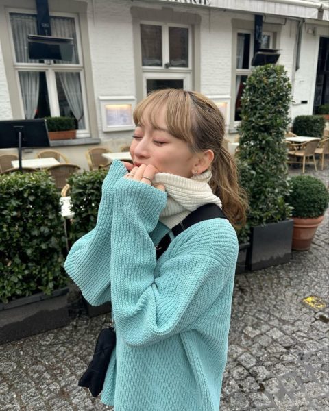 由布は「最近ゲットしたユニクロのニット」と綴り、少し低めのポニーテールにブルーと白ニットを着用して微笑む写真をアップ。
