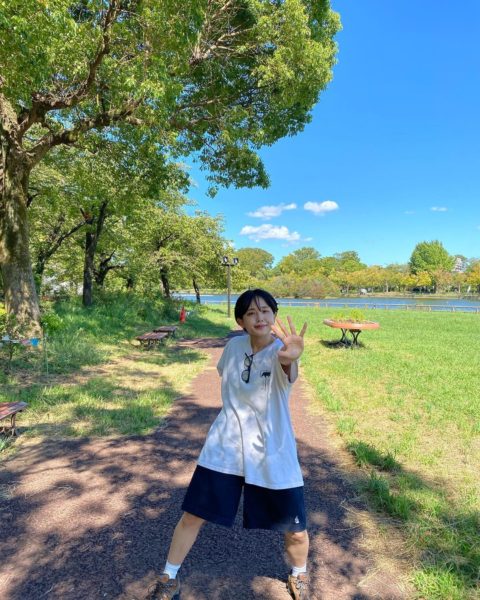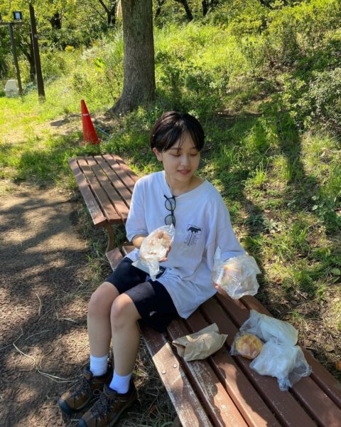 投稿では、Tシャツにハーフパンツ姿の真雪が、ベンチに座ってカメラを見上げている姿や、ベンチに座ってパンを持つ姿など、計6枚の写真が公開された。